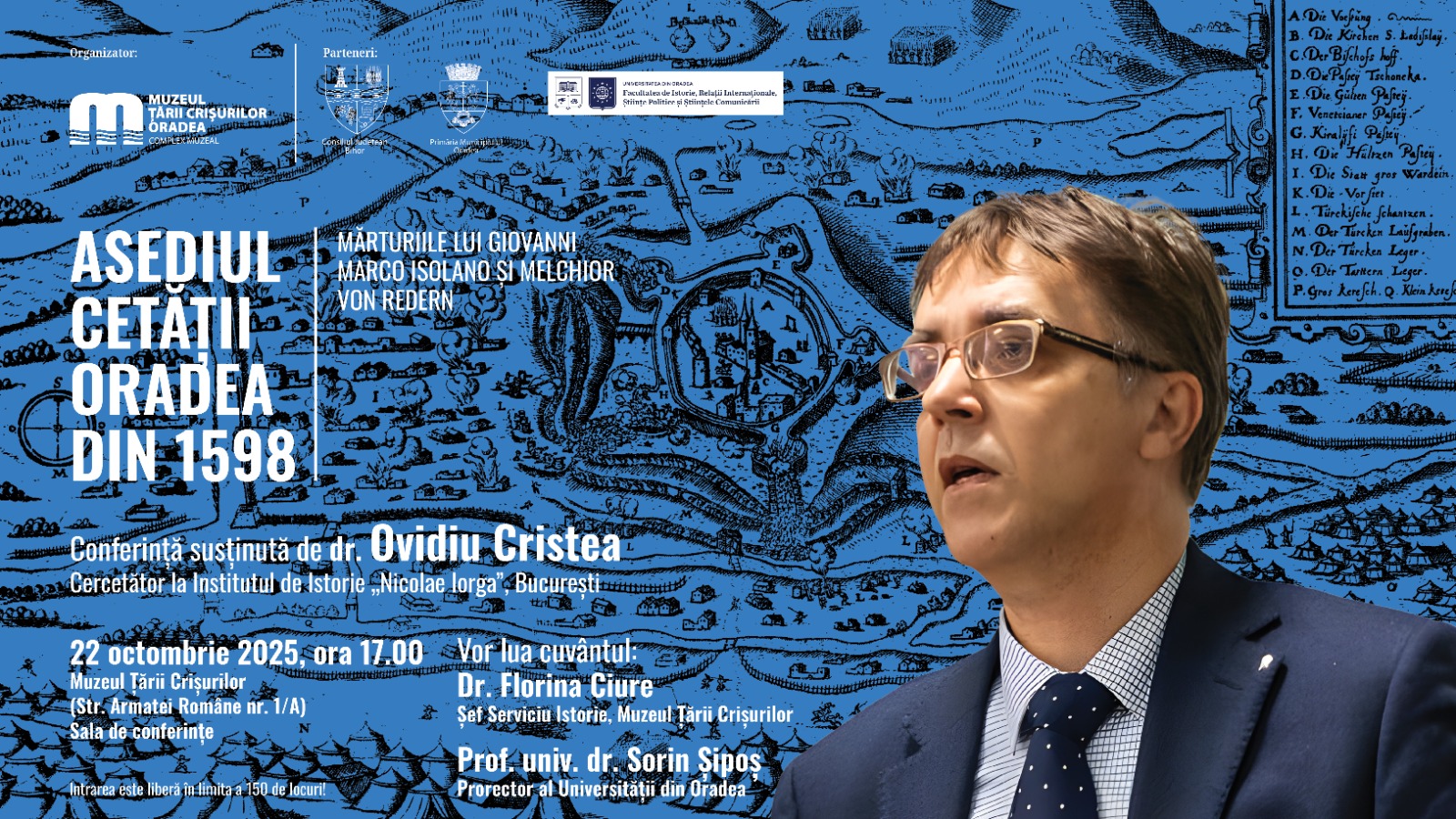 Facultatea de Istorie, Relații Internaționale, Științe Politice și Științele Comunicării din cadrul Universității din Oradea și Muzeul Țării Crișurilor Oradea - Complex Muzeal, în parteneriat cu Consiliul Județean Bihor, Primăria Municipiului Oradea, organizează conferința „Asediul cetății Oradea din 1598: mărturiile lui Giovanni Marco Isolano și Melchior Von Redern”, susținută de cercetător dr. Ovidiu CRISTEA, de la Institutul de Istorie „Nicolae Iorga” din București. Evenimentul va avea loc miercuri, 22 octombrie 2025, ora 17.00, în Sala de conferințe a Muzeului Țării Crișurilor (Str. Armatei Române nr.1/A). Moderatori vor fi dr. Florina CIURE, șef Serviciu Istorie al Muzeului Țării Crișurilor, și prof.univ.dr.habil. Sorin-Domițian ȘIPOȘ, prorector al Universității din Oradea.