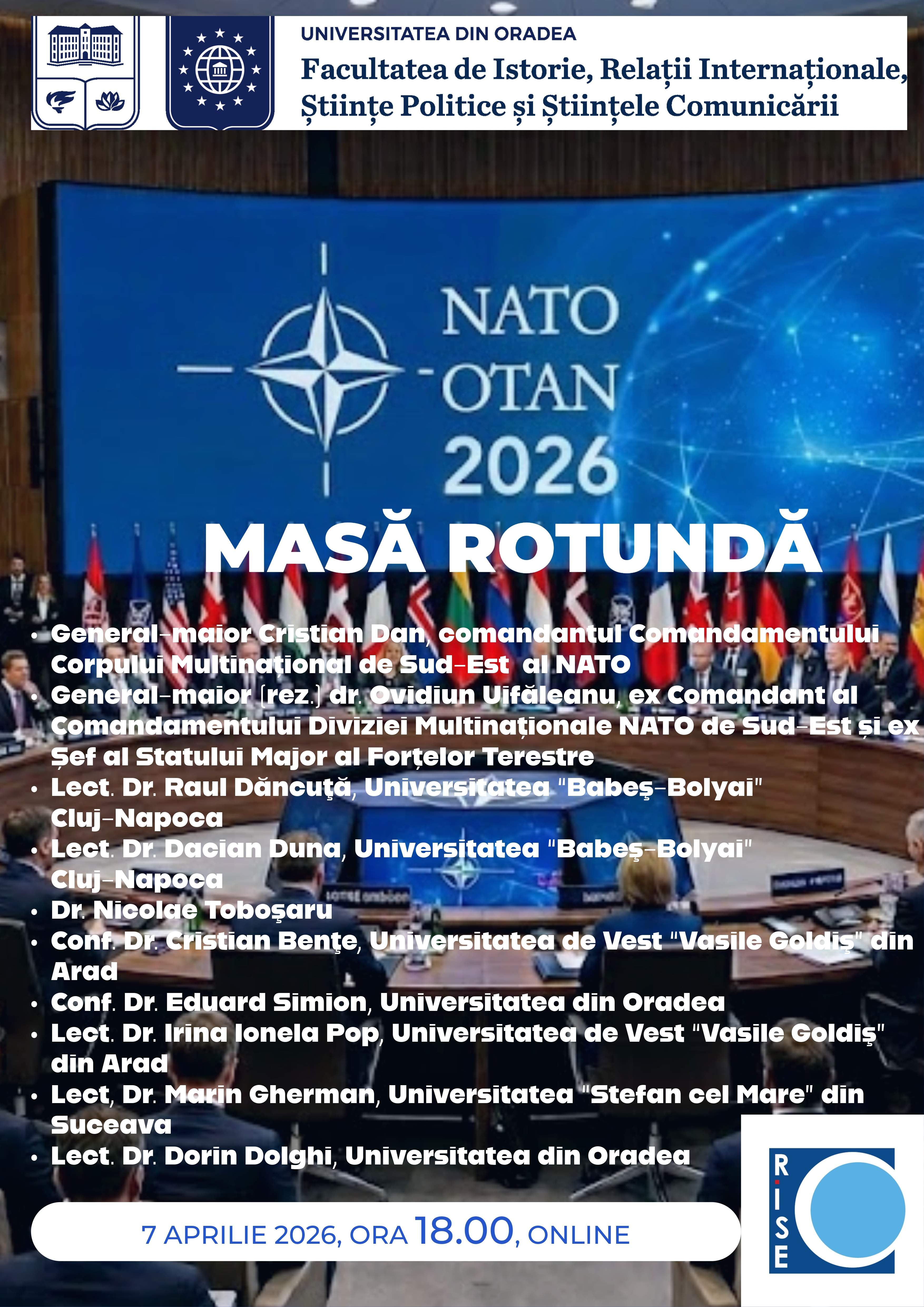 La eveniment, care a fost organizat în format on-line, au participat reprezentanţi din domeniul militar (General maior Cristian Dan, comandantul Comandamentului Corpului Multinaţional de Sud-Est al NATO, General maior (r) Ovidiu Uifăleanu) membri ai comunității academice românești, specialiști în domeniul relaţiilor internaţionale şi studii de securitate, alături de studenți de la specializările de licență și masterat (#RISE, #RISEE, #SS, #DRCI, #SEE, #SE).
