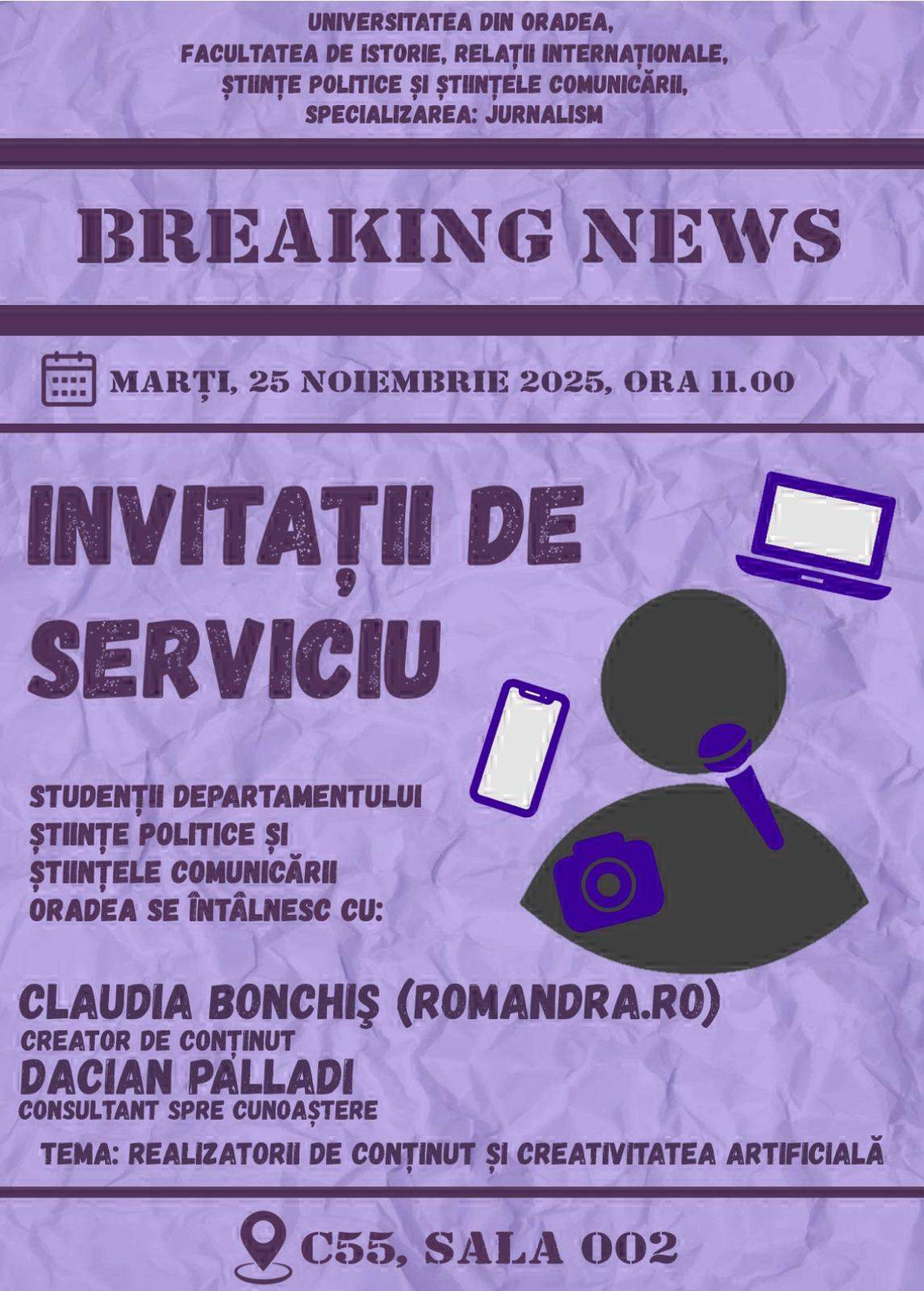 Marți, 25 noiembrie, va avea loc la sediul Departamentului de Științe Politice și Științele Comunicării o nouă ediție a evenimentului "Invitații de serviciu". Se vor întâlni de această dată cu studenții Claudia Bonchiş, blogger, fost jurnalist si Dacian Palladi, consultant spre cunoaștere, fost city manager al orașului Oradea. Tema discuției va fi legată de rolul creatorilor de conținut și cel al inteligenței artificiale folosite tot mai mult în actualitate în noile media.