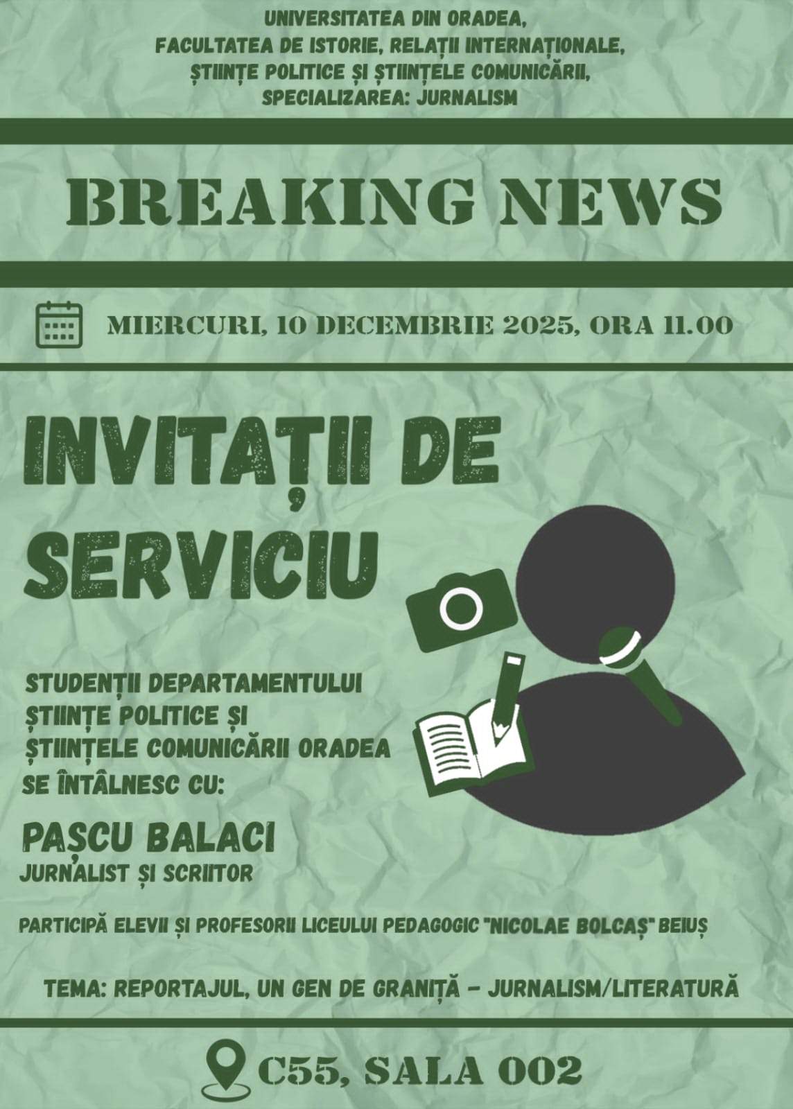 Ultima editie din 2025 a “Invitatilor de serviciu” a avut loc in 10 decembrie. Specialistul care le-a vorbit studenților facultatii noastre de această data a fost Pașcu Balaci, fost jurnalist, scriitor si avocat. Tinerii au aflat de la acesta care sunt diferentele dintre reportajul jurnalistic si cel literar, cum apare inspiratia pentru a scrie un reportaj, dar si ce calitati trebuie sa fie un ziarist pentru a putea scrie astfel de genuri jurnalistice.  Povestile specialistului au fost savuroase, multe dintre reportajele sale fiind istorisite de invitat sau citite de cei din sala, deoarece dnul Balaci a adus pentru exemplificare ziarele Flacara si Crisana in care materialele au fost tiparite. Pe langa ziare, Pascu Balaci a prezentat o parte din multele sale volume, in care se regasesc reportaje si le-a recitat sonete, compuse tot de el. Alaturi de studenti, au participat si doua clase de elevi de la Liceul Pedagogic Nicolae Bolcas din Beius, insotite de doamnele profesoare Ioana Iordache si EcaterinaDomocos.